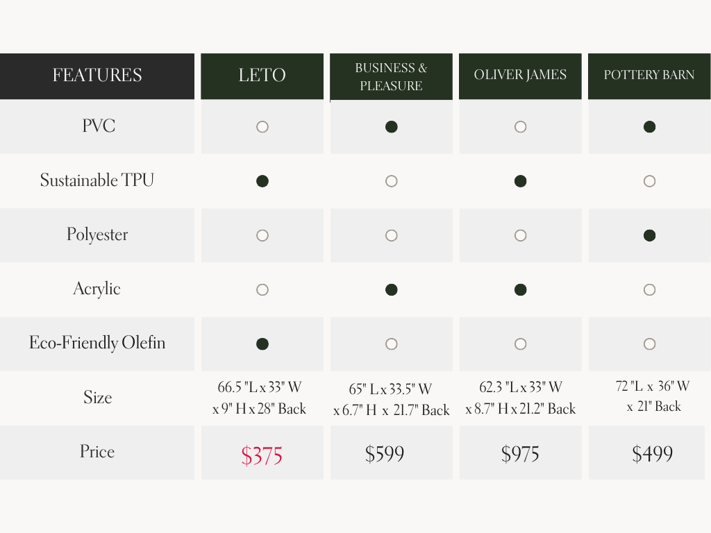 While Acrylic is certainly a better, more durable choice of outdoor fabric compared to cheap Polyester, it is extremely toxic to manufacture. Olefin is a much more eco-friendly choice, with all the durability of Acrylic while being much less toxic to manufacture and easier to recycle. LETO has chosen to invest in sustainable, high-quality materials like TPU and Olefin, even if it means higher manufacturing costs, to ensure your Pool Chaise provides long-lasting durability and exceptional value for years to come.